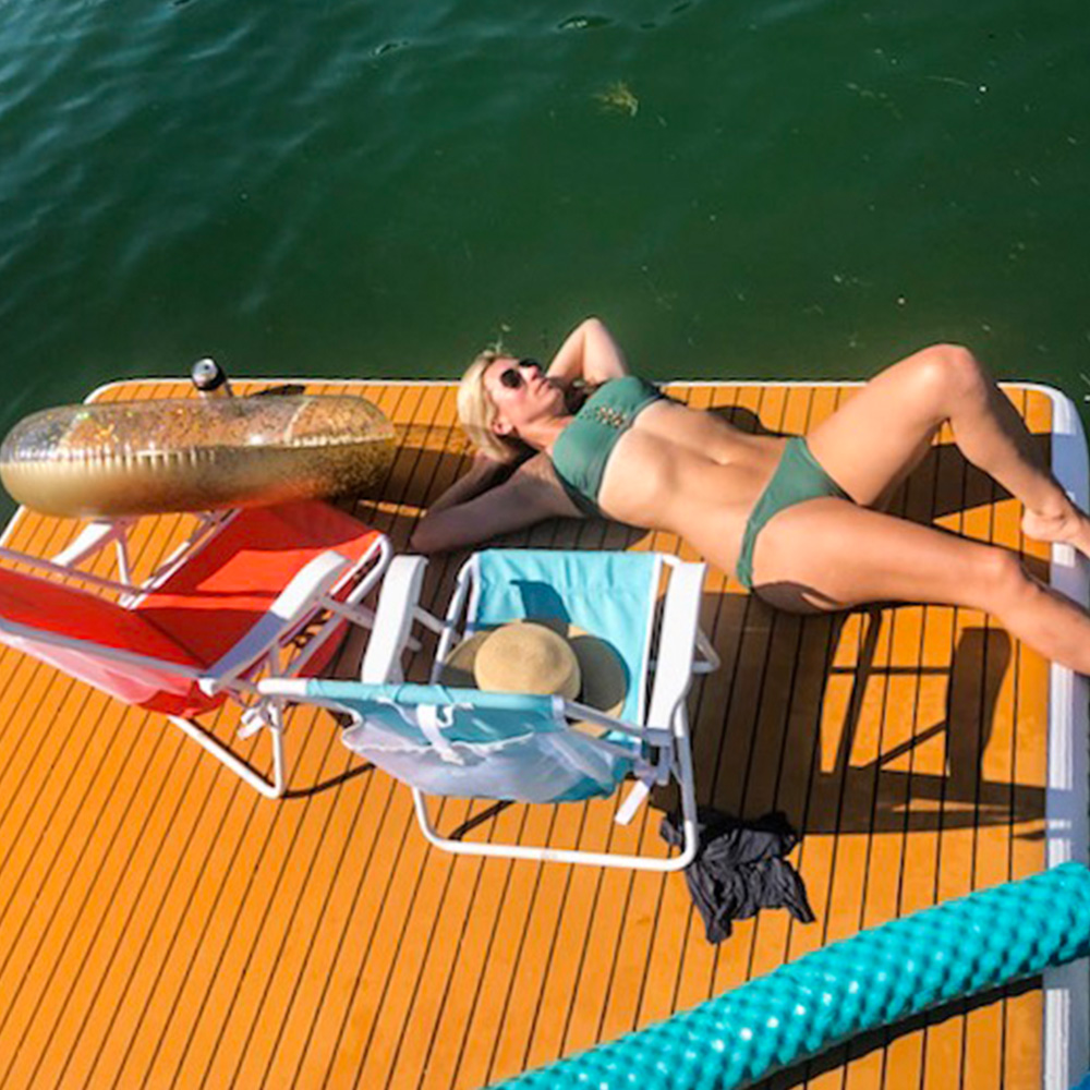 The luxury of your own dock, deck or island with the convenience of being able to deflate and easily transport it. Works great as a beach lounger! Extend your deck by up to 8 feet. Complete with a simulated teak splinterless deck -- provides traction and keeps the deck cool -- atop heavy duty Military Grade PVC float. Fun for the whole family! Comes with faux teak traction pad and 10 stainless steel D-rings along the perimeter of the dock. Inflated with a dual action pump and carrying bag included. Weighs 49 lbs deflated, holds up to 1,500 lbs inflated.