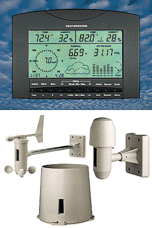 Finally a complete weather station for a reasonable price. There's no wiring mess because each sensor reports to the main station, up to 330 ft away via radio waves. Each sensor is solar powered with a lithium battery backup. It's like having your own US weather service-monitoring site right at home, complete with weather predictions. Station reports wind speed & direction, temperature & humidity both indoor and outdoor and rainfall. Optional computer interface allows you to access weather data form anywhere.